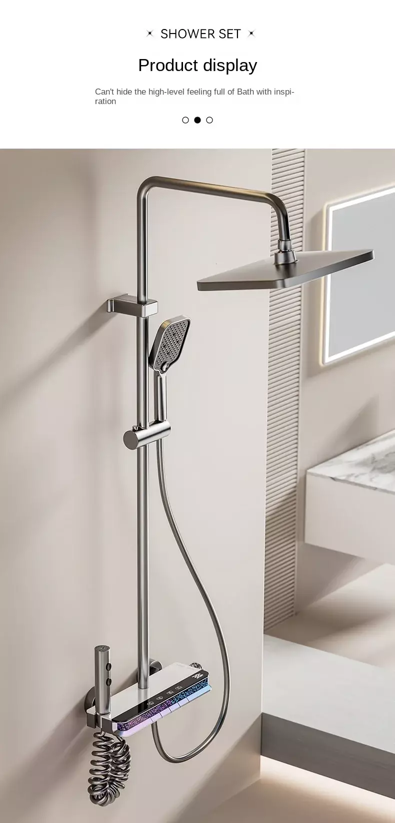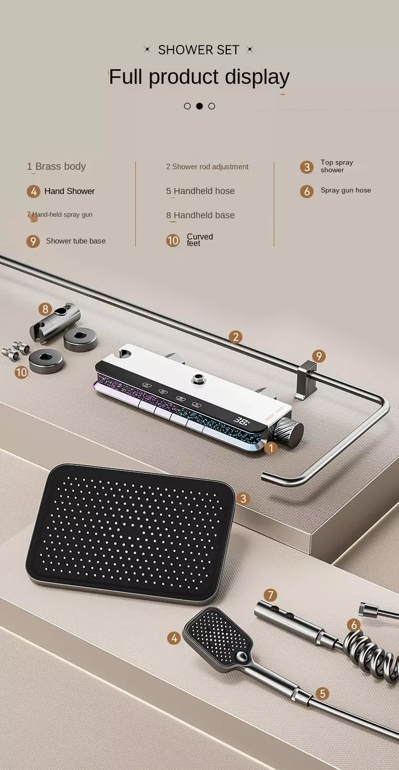 This Copper Bathroom Shower Full Set is a high-end solution for modern bathroom upgrades. Centered on all-copper materials and digital thermostatic control technology, it integrates a large-size rain shower head, a handheld shower head, digital temperature control, and a thermostatic mixing valve (similar to other all-copper thermostatic shower sets in the industry).