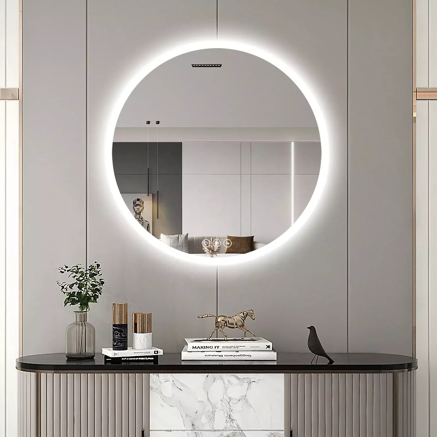 This Frameless Round LED Bathroom Mirror combines contemporary aesthetics with practical functionality for modern interiors. The mirror features a seamless frameless design with integrated LED lighting that evenly illuminates your face and surroundings, making it perfect for bathroom vanities, dressing areas, hotel suites, or spas. Illuminated mirrors like this one use LED light strips around the perimeter, creating soft ambient light that is energy-efficient and visually comfortable.