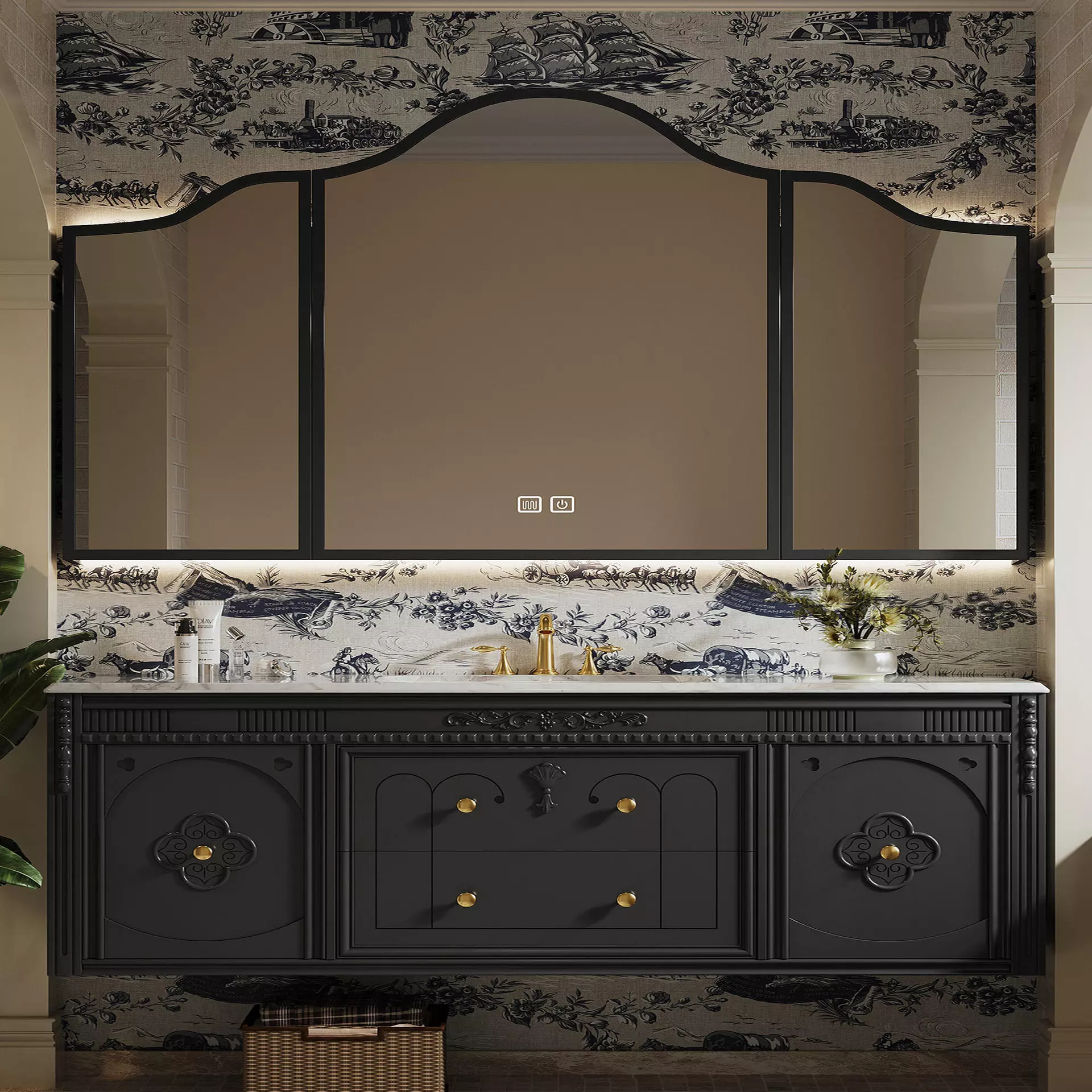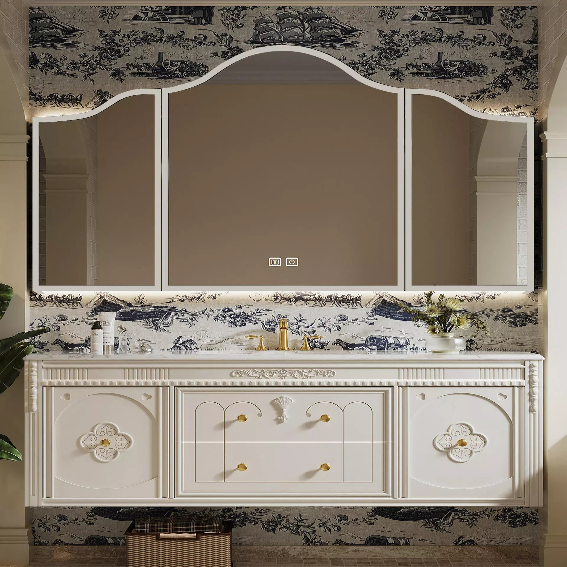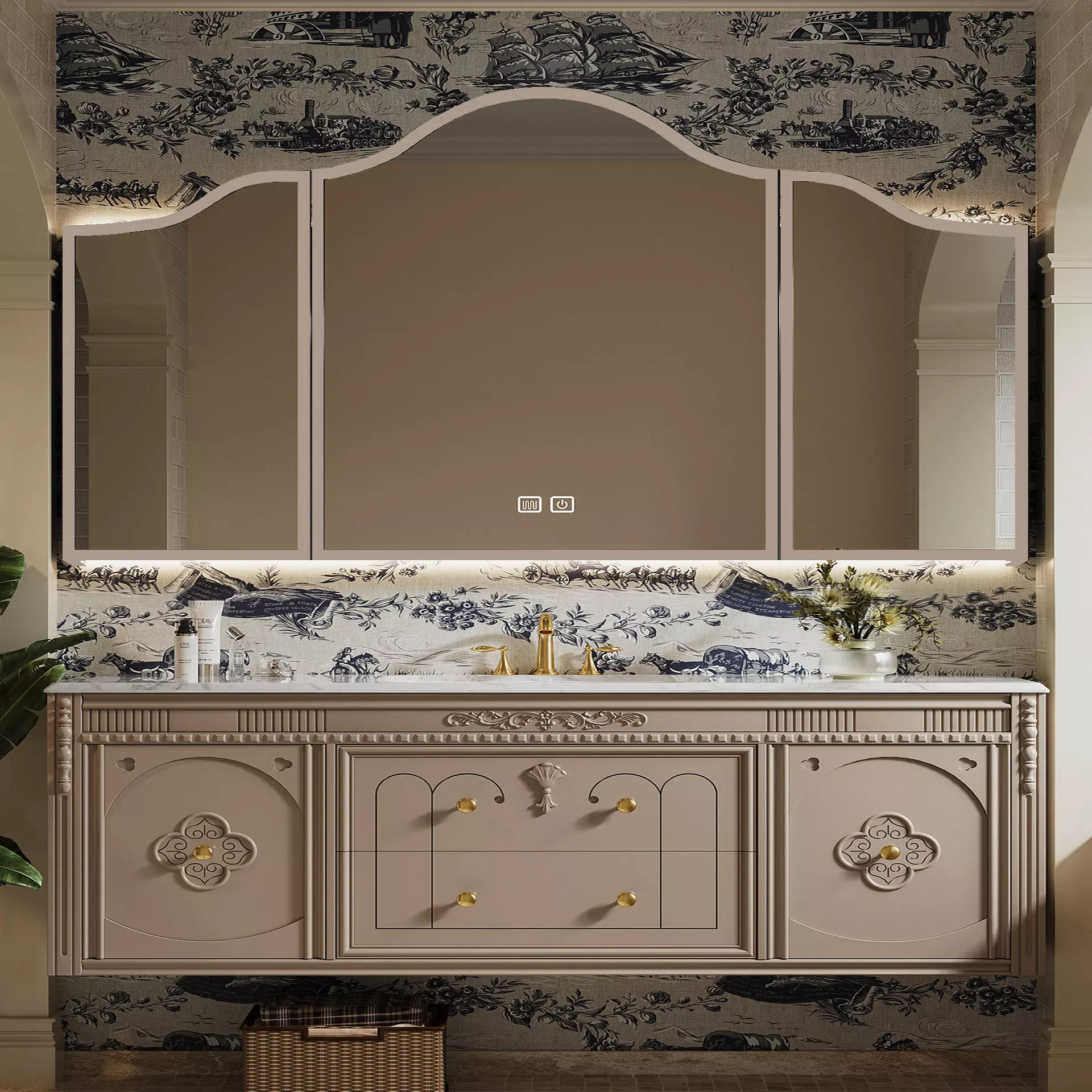 This bathroom vanity features a classic French country style that combines rustic charm with refined elegance.
