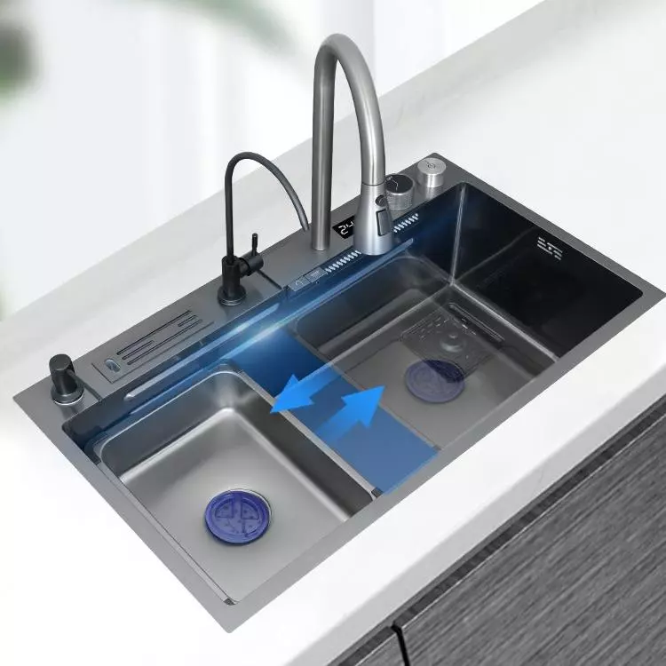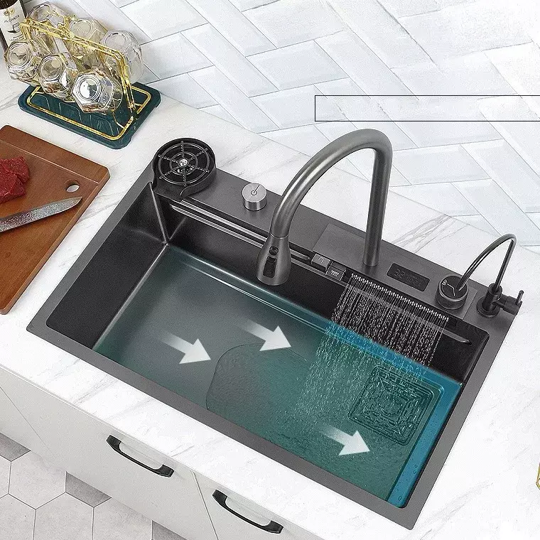 This Nano Black Modern Rectangular Handmade Kitchen Sink is a stylish and functional sink designed for contemporary kitchen spaces. Crafted with high-quality stainless steel and a nano black brushed surface, it delivers long-lasting corrosion resistance and visual appeal suitable for modern homes and commercial installations. Featuring a rectangular single bowl layout, this sink is ideal for above-counter installation and can easily match a variety of kitchen decors.