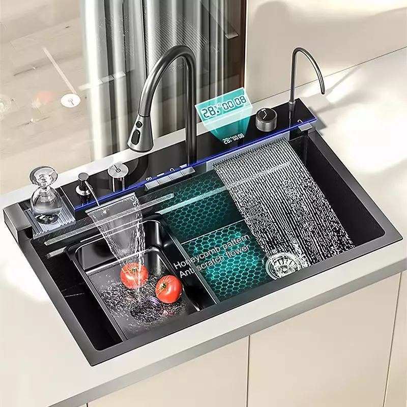 ဤ HG Modern Luxury Smart Multifunctional Black Kitchen Sink သည် မည်သည့်မီးဖိုချောင်အပြင်အဆင်ကိုမဆို ပိုမိုကောင်းမွန်စေမည့် ခေတ်ပြိုင်အသွင်အပြင်အတွက် ပြောင်လက်တောက်ပသော နာနိုအနက်ရောင်အကာဖြင့် ပရီမီယံ 304 stainless steel ၏ကြာရှည်ခံမှုကို ပေါင်းစပ်ထားသည်။ ၎င်း၏ ဘက်စုံသုံး ဒီဇိုင်းသည် နေ့စဉ် မီးဖိုချောင်အလုပ်များကို လိုက်လျောညီထွေဖြစ်စေသည်။—မီးဖိုချောင်သုံးပစ္စည်း အကြီးကြီးများကို ဆေးကြောခြင်းမှ ထမင်းစားပြင်ဆင်ခြင်းအထိ—ကြာရှည်ထိန်းသိမ်းထားစဉ်-ကြာရှည်ခံသောစွမ်းဆောင်ရည်နှင့် ထိန်းသိမ်းမှုလွယ်ကူခြင်း။