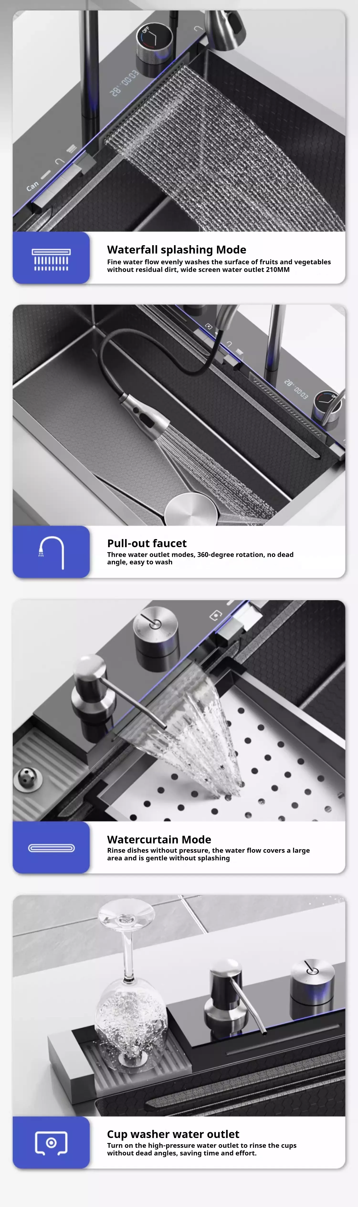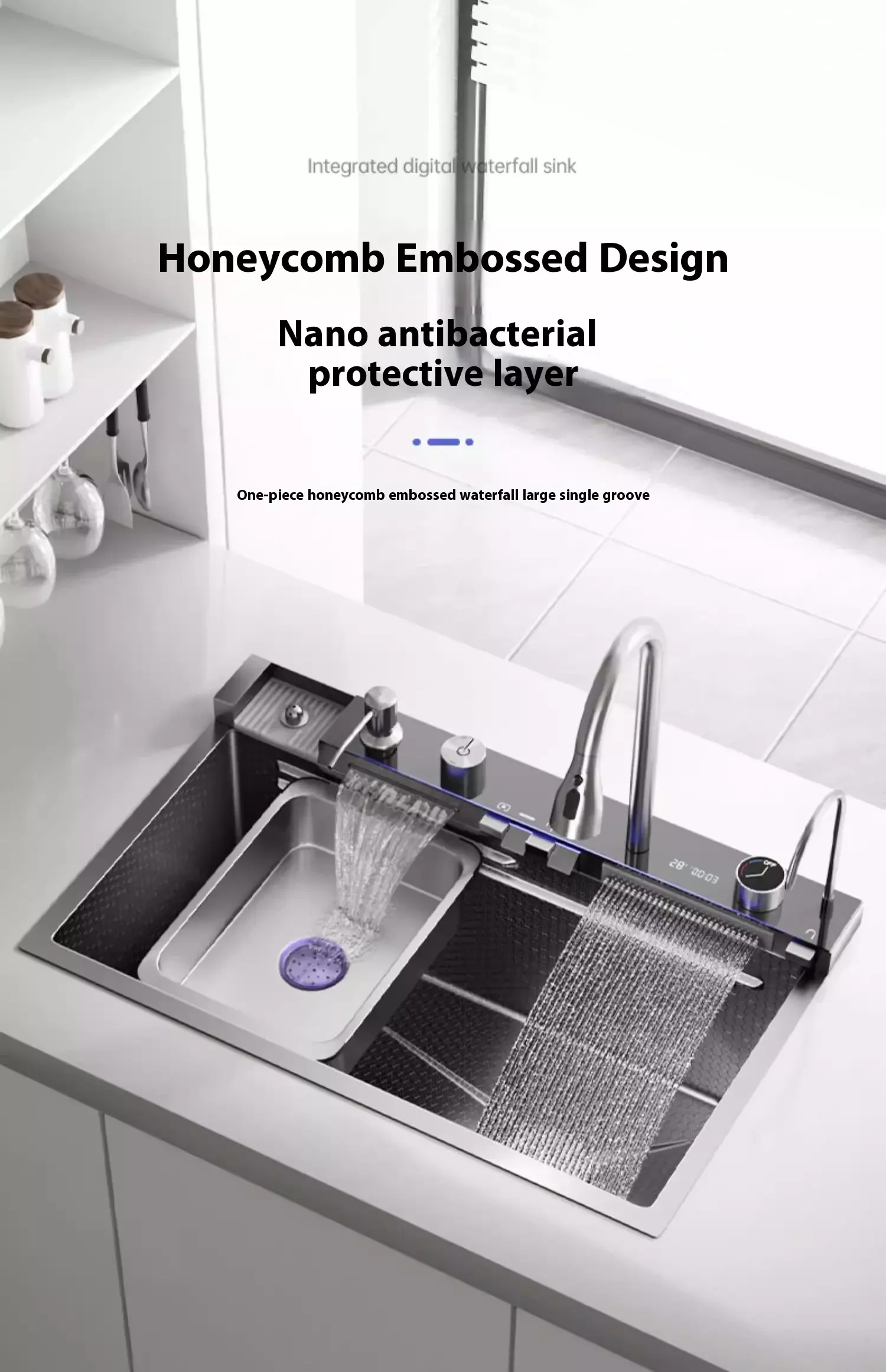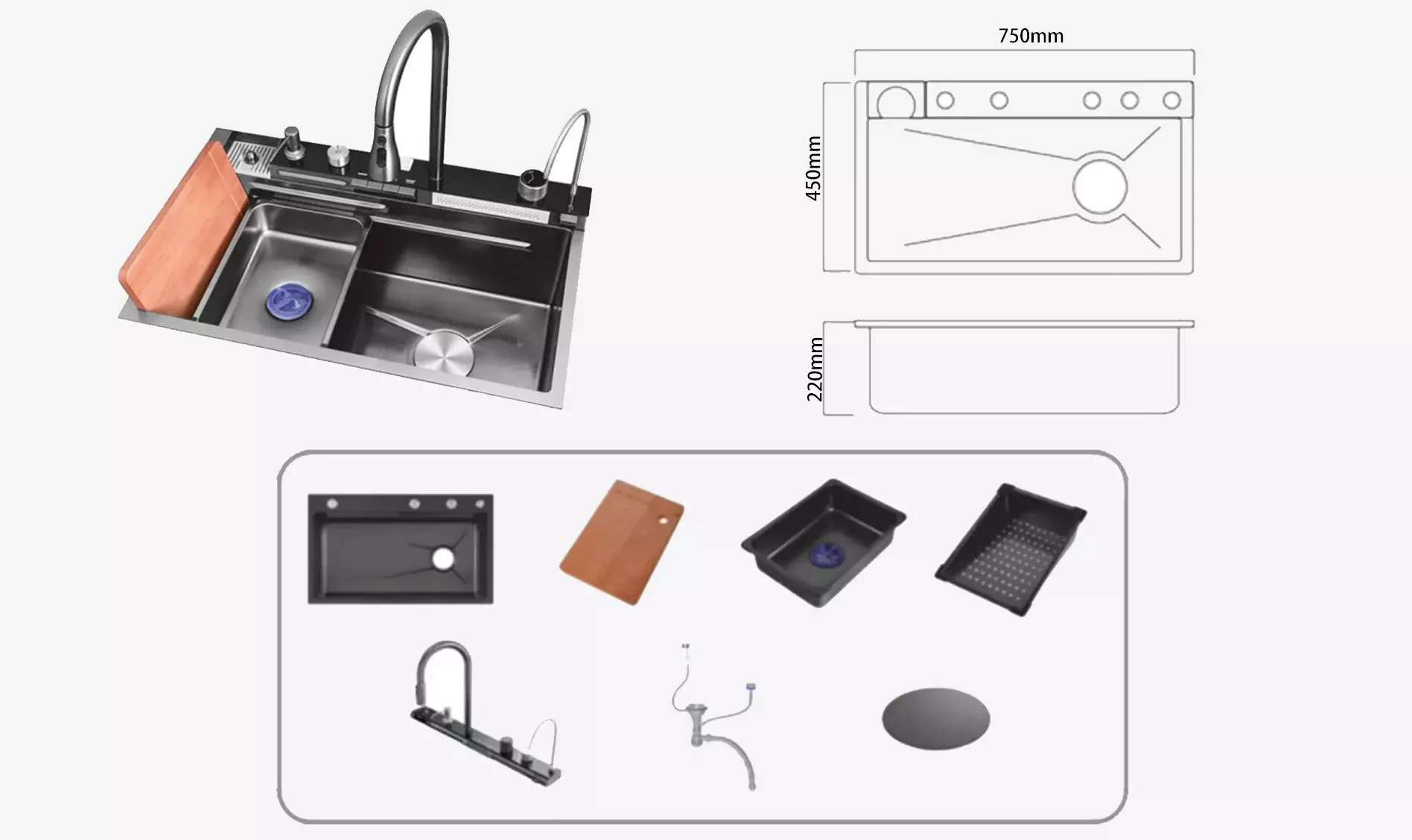 ဘက်စုံသုံး ဒီဇိုင်း — ကျယ်ဝန်းသော ပန်းကန်လုံးတစ်လုံး သို့မဟုတ် ရွေးချယ်နိုင်သော ဘက်စုံသုံး အဆင်အပြင်သည် ပန်းကန်ဆေးခြင်း၊ အစားအသောက်ပြင်ဆင်ခြင်းနှင့် ဆက်စပ်ပစ္စည်းများ ပေါင်းစပ်မှုကို ပံ့ပိုးပေးသည် (ဖြတ်ညှပ်ဘုတ်၊ ရေနုတ်မြောင်း စသည်တို့။)