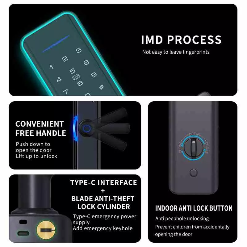 Product Sizes:359*32*22MM Door thickness: 40mm-100mm Color : black /Golden Power supply :4PCS AA battery/Type-C emergency power supply Unlocking method :Tuya APP/password/fingerprint/IC card/mechanical key Fingerprint head type :Semiconductor fingerprint head