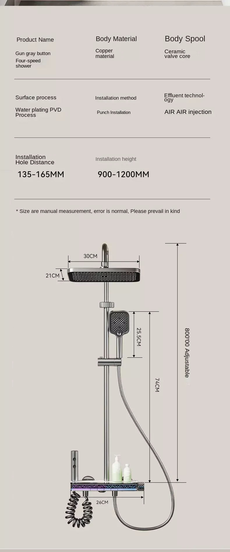 The following are typical specifications for this type of all-copper shower set with digital display. Specific data needs to be confirmed with the supplier: