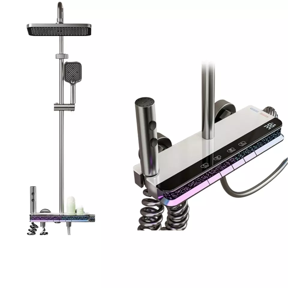 This Copper Bathroom Shower Full Set is a high-end solution for modern bathroom upgrades. Centered on all-copper materials and digital thermostatic control technology, it integrates a large-size rain shower head, a handheld shower head, digital temperature control, and a thermostatic mixing valve (similar to other all-copper thermostatic shower sets in the industry).