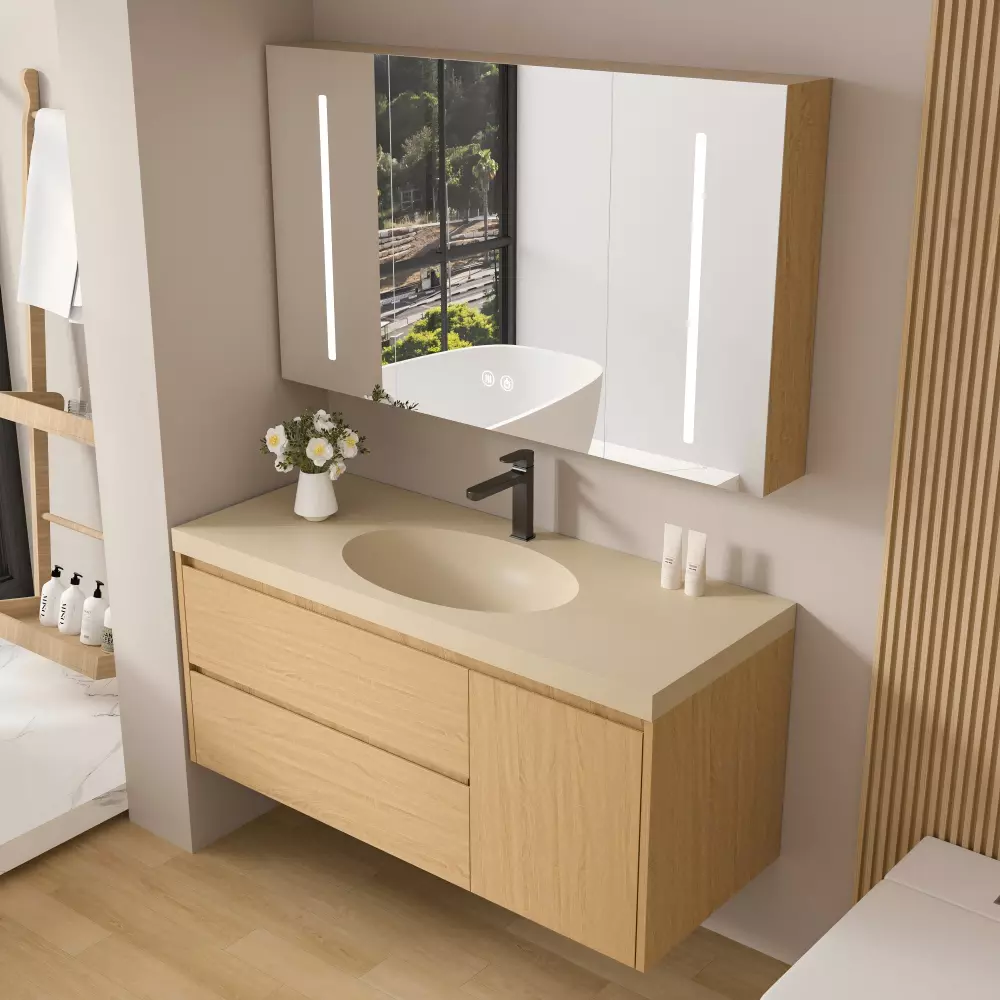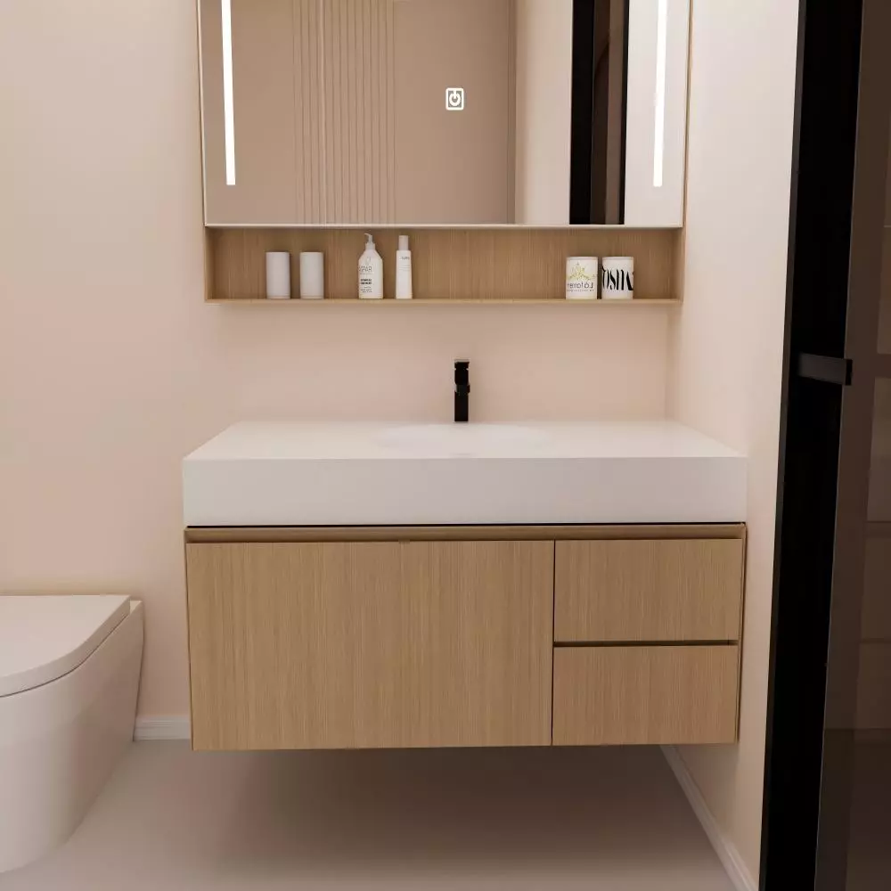 The High End Bathroom Vanity Set combines modern aesthetics, premium material construction and practical functionality to create an elegant centerpiece for contemporary washrooms. Designed for resilience in humid bathroom environments, this vanity set typically incorporates water-resistant cabinetry with a smooth surface finish, engineered panels or solid wood composites, and an integrated wash basin for a cohesive design.