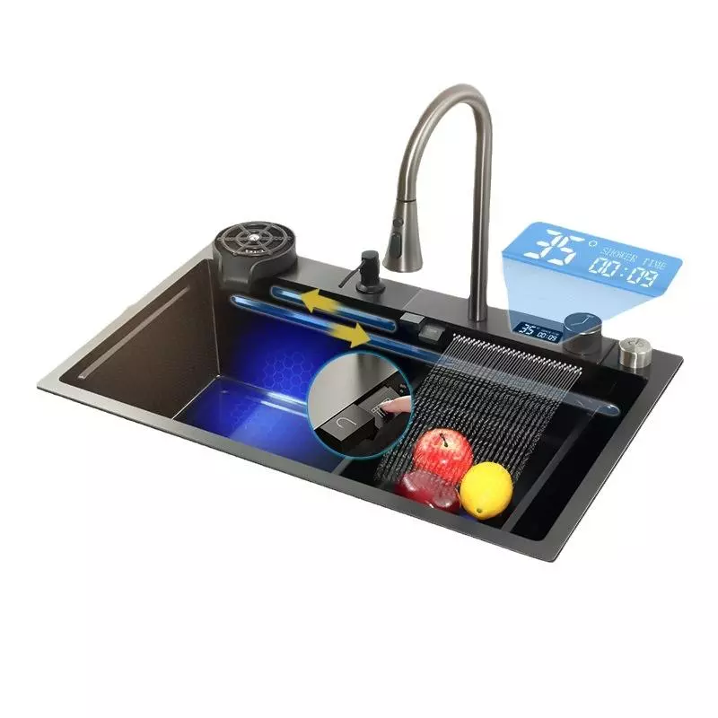 This Nano Black Modern Rectangular Handmade Kitchen Sink is a stylish and functional sink designed for contemporary kitchen spaces. Crafted with high-quality stainless steel and a nano black brushed surface, it delivers long-lasting corrosion resistance and visual appeal suitable for modern homes and commercial installations. Featuring a rectangular single bowl layout, this sink is ideal for above-counter installation and can easily match a variety of kitchen decors.